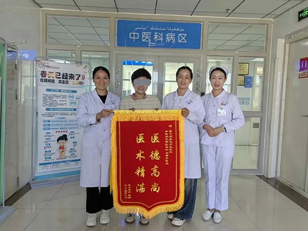 2025年9月28日,一面印有“医德高尚 医术精湛”的锦旗送到了援疆专家亢秀红的手中。9月12日,黄女士因“发热、咳嗽、呼吸困难4天”在我院呼吸与危重症医学科住院治疗,完善检查后诊断为:重症肺炎、急性呼吸衰竭(I型呼吸衰竭)、EBV阳性炎性滤泡树突状细胞肉瘤(pTxNxMx,无法分期)、耶氏肺孢子菌感染、呼吸性碱中毒等,经治疗患者发热、呼吸困难症状减轻,仍咳嗽、咳痰明显,汗出多,大便干,听说亢医生再次来到北屯市总医院,黄女士便找到亢医生联合中医治疗,经中医辩证后给予中药口服,经中西医结合治疗10天,患者临床症状逐渐缓解,影像学提示肺炎明显吸收,出院当天黄女士手握锦旗表达对亢医生的感谢。
