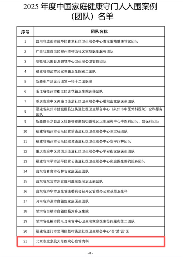 喜报|北京航天总医院心血管内科入围2025年度中国家庭健康守门人