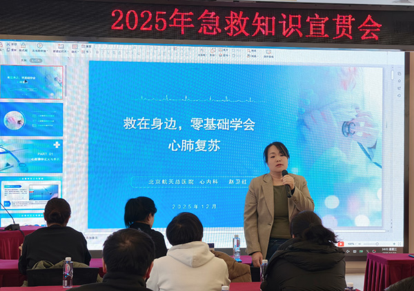北京航天总医院心血管内科一区护士长赵卫红以“救在身边——零基础学会心肺复苏”为题授课。她用通俗易懂的语言拆解了心肺复苏的每一个关键步骤:“发现有人倒地,首先要确保环境安全,然后轻拍重喊判断意识,立即呼救并拨打120,接着定位按压点——两乳头连线中点,以每分钟100-120次的频率、5-6厘米的深度持续按压……”她还特别指出,在航天科研这样的特殊环境里,时间就是生命,早期有效的心肺复苏能将抢救成功率提高2-3倍。