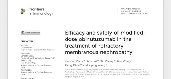近日,北京航天总医院肾内二科传来科研捷报。由该科周健楠医生作为第一作者、王艺萍主任作为通讯作者的研究论文《Efficacy and Safety of Modified-Dose Obinutuzumab in the Treatment of Refractory Membranous Nephropathy》正式发表于国际免疫学领域权威期刊 《Frontiers in Immunology》 (2024年影响因子5.9,5年影响因子6.8,JCR分区Q1区,中科院医学大类2区)。这标志着我院肾脏病学科在免疫性肾脏病精准治疗研究领域取得具有国际影响力的重要突破,也为北京航天总医院的学科发展与科研实力注入了强劲动力。